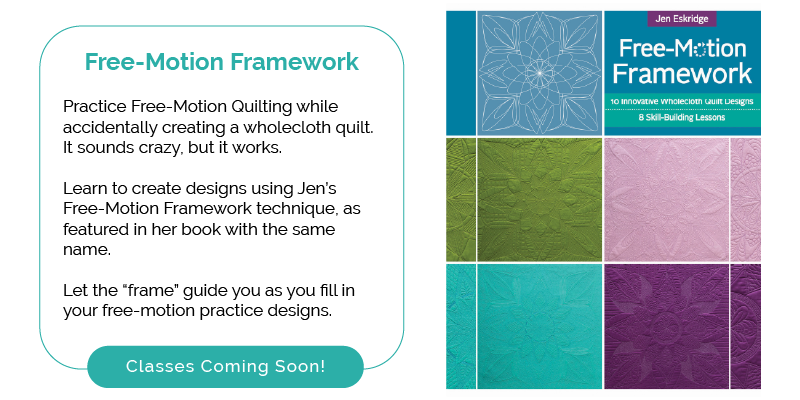 Introducing the Free-Motion Feather Sampler. (Scroll down to see the class sample.) Learn to make 10 different feather styles in, on, and around a provided frame-guideline design. This follows the method in my book, Free-Motion Framework. You are going to LOVE this project.