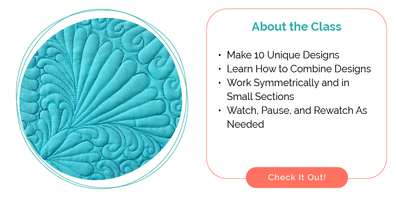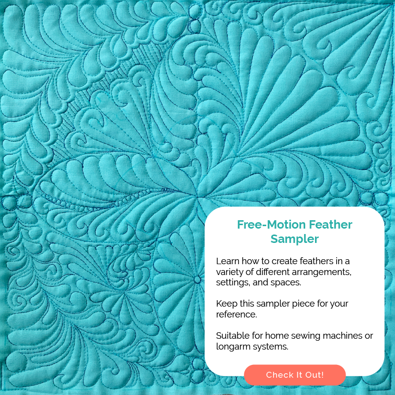 Learn to make 10 different feather styles in, on, and around a provided frame-guideline design with on-demand video instruction from the Quilty Quill.