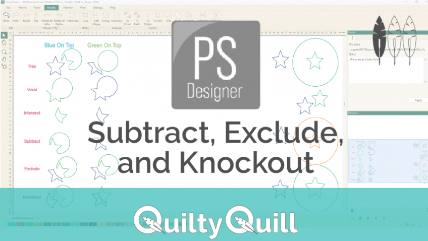 Make a quick reference guide to three new tools: Subtract, Exclude, and Knockout. These shaping tools are not in the PS Designer Manual.